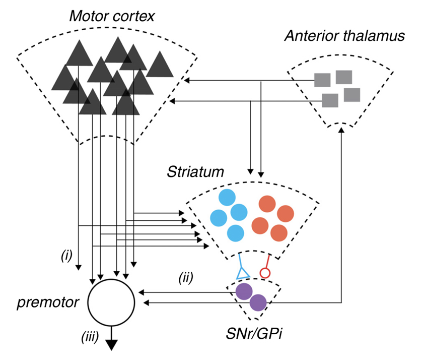 Figure 3. A schematic representation of the cortico-basal ganglia-thalamic circuit in mammals. Pathway i: corticofugal projection neurons from motor areas of cortex projecting both to brainstem and spinal cord targets. These same neurons elaborate extensive collaterals in the dorsal striatum. The dorsal basal ganglia is composed of a primary input structure, striatum, which contains two opponent populations of projection neurons (schematized in blue and red) that together provide an opponent projection onto the major output nuclei, substantia nigra pars reticulate (SNr) and internal globus pallidus (GPi) (purple). In addition, the dramatic reduction in projection neuron number from cortex to striatum to SNr is indicated by the decreasing size of the schematic representations. Finally, SNr output both projects feed-forward onto premotor neurons in the pontine nuclei and superior colliculus schematized by pathway ii as well as projecting recurrently to anterior thalamic nuclei (i.e., ventrolateral, ventromedial) that project back to cortex and striatum. Dudman and Krakauer have postulated that overt movement kinematics (pathway iii) result from the combination of motor command signals (pathway i) and reward processing control signals (pathway ii). Reproduced with permission from Dudman & Krakauer, Curr Opin Neurobiol, 2016 [28].
