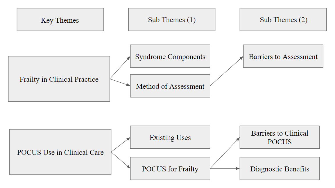 Two key areas for analysis identified through thematic analysis were defining frailty in clinical practice and the use of POCUS within clinical care (Figure 1).