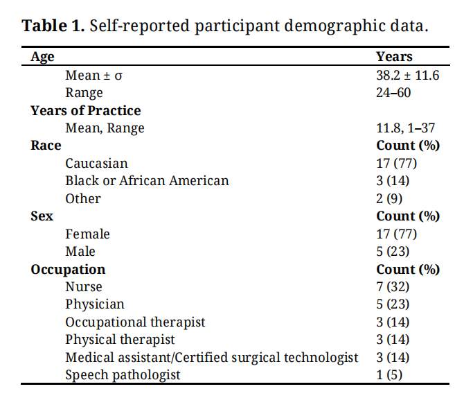 A total of 22 participants were recruited for this study. Participant demographics varied in age, years of practice, and occupation as outlined in Table 1.