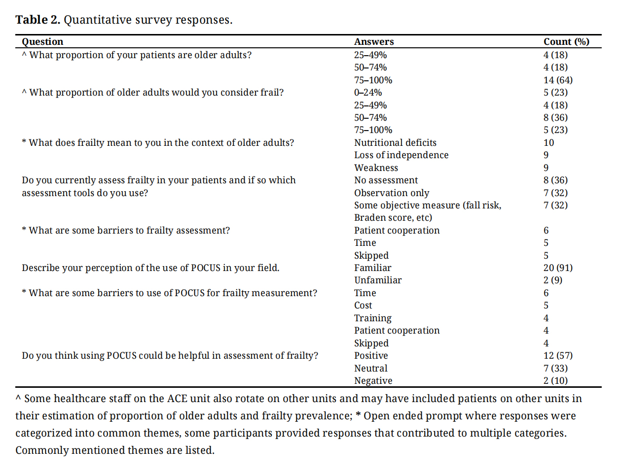 Limitations of our study include a predominance of Caucasian and female participants in the sample. Furthermore, interview transcripts were coded by a single researcher. Saturation in responses was not achieved and while some core themes were elucidated, responses varied widely due to the small sample size. Generalizability is also somewhat limited given recruitment from a single, specialized hospital unit. Lastly, our study addressed the perspectives of healthcare staff towards POCUS rather than the perspectives of patients. Since our study found that healthcare staff perceived patient cooperation as a barrier to both frailty assessment and POCUS, it will be important for future studies to address their perspective.