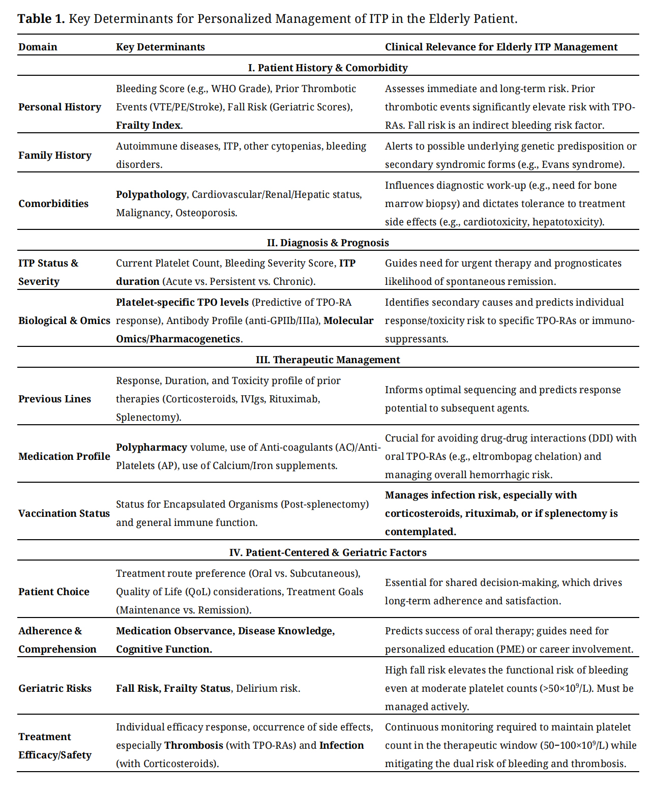 Risk stratification represents a major gap in the management of elderly patients with ITP. Existing bleeding scores and platelet count thresholds do not adequately capture age-related modifiers such as frailty, vascular disease, atrial fibrillation, or the frequent use of antiplatelet and anticoagulant therapies. As a result, clinicians lack validated tools to balance bleeding risk against the heightened thrombotic risk characteristic of this population [4].