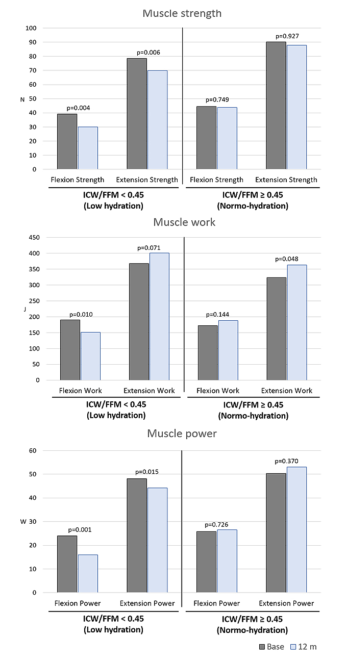 Finally, Table 4 reports, separately for women and men, the effect of baseline right-leg ICW/FFM on 12-month improvements in right-leg muscle function. After adjusting for age, sex, and number of medications, an independent effect of baseline ICW/FFM was evident for right-leg improvements in extension strength (beta = 1120 N, p = 0.078), extension work (beta = 2356 J, p=0.017), and extension power (beta = 1921 W, p = 0.021), and in flexion strength (beta = 1610 N, p = 0.134), flexion work (beta = 6270 J, p = 0.008), and flexion power (beta = 5183 W, p = 0.003). Figure 1 compares basal and 12-month muscle function parameters by hydration status. Muscle strength and power decreased at 12-month follow-up in subjects with low hydration, while did not change in normo-hydated subjects.
