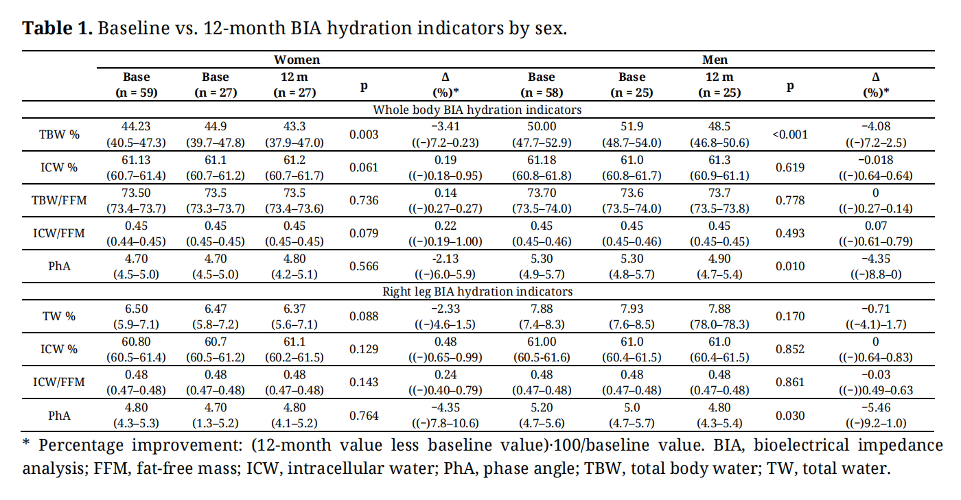 Hydration Status and Muscle Function Changes at 12 MonthsTables 1 and 2 report, separately for women and men, 12-month changes in BIA hydration and isokinetic muscle function parameters. TBW decreased by 3.8% in women and by 5.3% in men, PhA decreased by almost 4% in men, and there were no significant changes in ICW%, TBW/FFM, ICW/FFM in neither men nor women. As for muscle function, flexion strength and power decreased in women by 11.8% and 10.0%, respectively, while extension work in men increased by 11.3%.