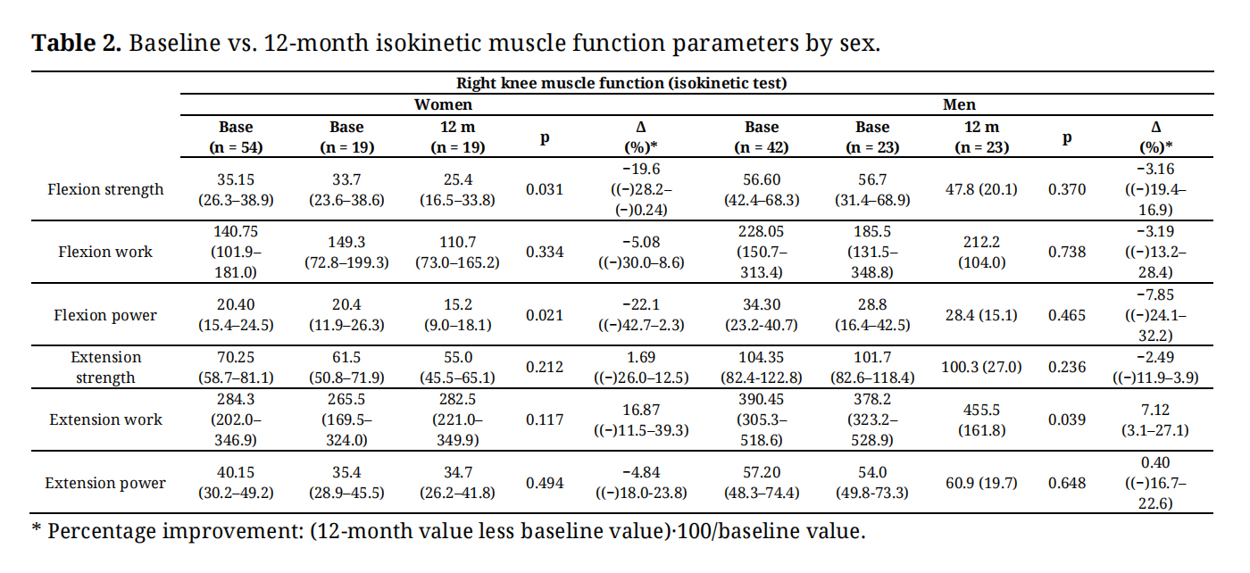 Assessed at the 12-month follow-up visit were 52 individuals, reflecting a 55.5% loss to follow-up. Reasons for dropping out were voluntary withdrawal (no wish to continue) (62.9%), non-performance of the isokinetic test (due to pain, recent surgery, heart problems, or bone fractures) (18.5%), inability to locate participants (11.1%), and death (3.7%). No age or sex differences were observed between losses and non-losses to follow-up. At follow-up, 3.7% of individuals were considered to be frail (0 men and 2 women) and 7.4 % to be sarcopenic (2 men and 2 women).