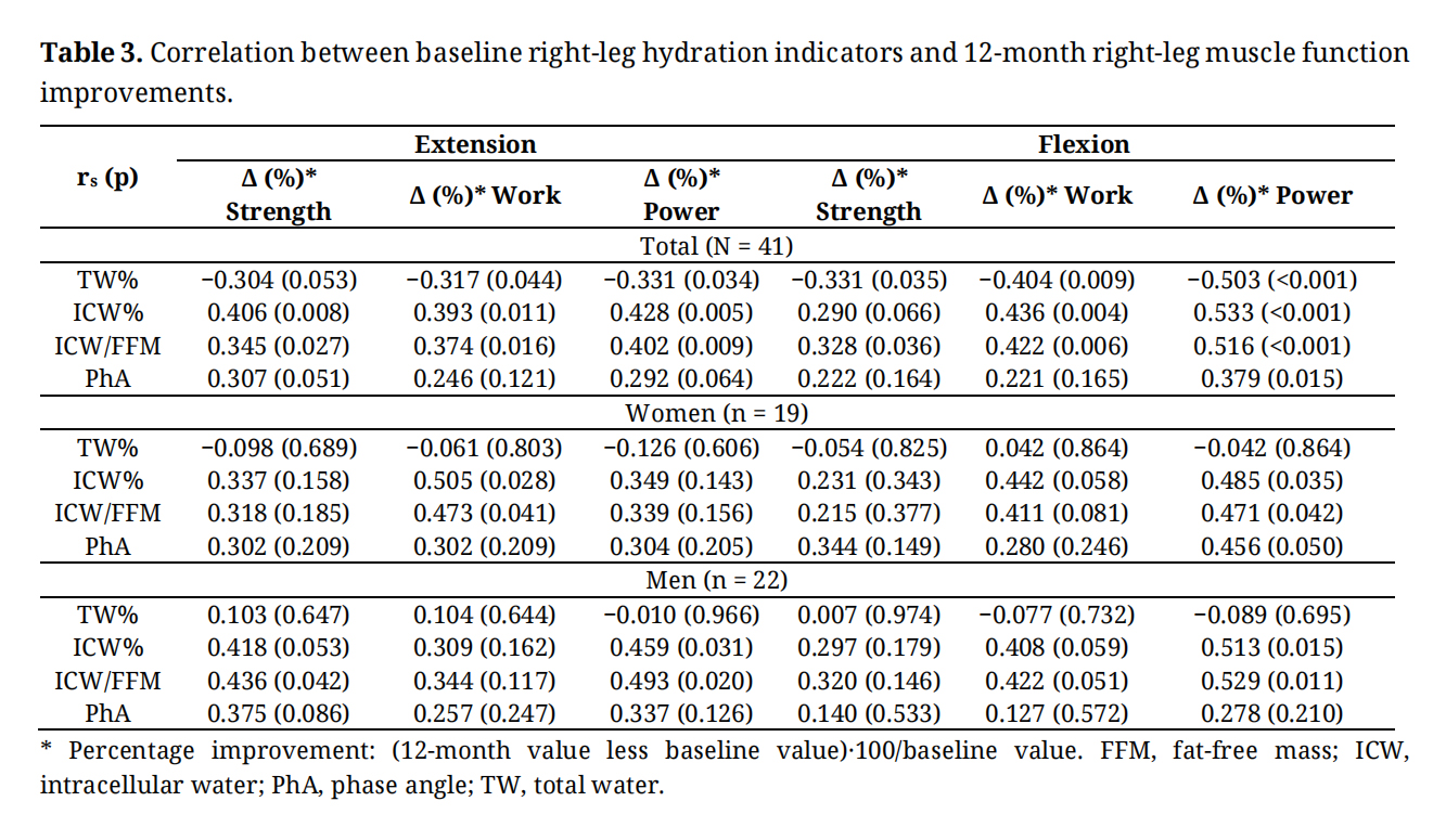 Baseline Hydration and 12-Month Muscle Function ImprovementsThe hydration-muscle function relationship was analysed for both legs, but as no relevant differences were observed between legs, in the interest of brevity we report findings only for the right leg. Table 3 reports, separately for women and men, correlations between baseline right-leg BIA hydration parameters and 12-month improvements in right-leg muscle function. In women, baseline ICW% and ICW/FFM were positively correlated with 12-month increases in extension work (rs = 0.50 [p = 0.028] and rs = 0.47 [p = 0.041], respectively), flexion work (rs = 0.44 [p = 0.058] and rs = 0.41 [p = 0.081], respectively) and flexion power (rs = 0.48 [p = 0.035] and rs = 0.47 [p = 0.042], respectively). In men, baseline ICW% and ICW/FFM were positively correlated with 12-month increases in extension strength (rs = 0.42 [p = 0.053] and rs = 0.44 [p = 0.042], respectively), extension power (rs = 0.46 [p = 0.031] and rs = 0.49 [p = 0.020], respectively), flexion work (rs = 0.41 [p = 0.059] and rs = 0.42 [p = 0.051], respectively), and flexion power (rs = 0.51 [p = 0.015] and rs = 0.53 [p = 0.011], respectively). Baseline PhA was not correlated with an improvement in any muscle function parameter in neither men nor women.