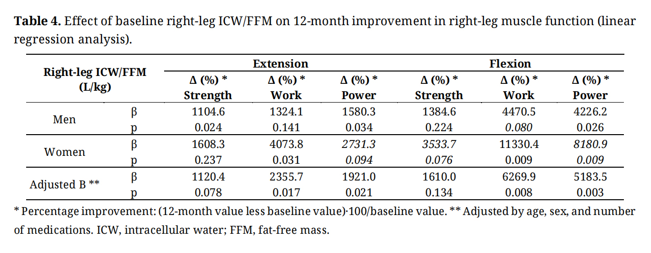 Continuous variables were described using median and interquartile ranges values, and categorical variables were described using percentages. Normality was tested using the Shapiro–Wilk test. Baseline and 12-month parameters were compared using the Wilcoxon test (paired data). Spearman’s correlation coefficient (rs) was used to assess the relationship between hydration indicators and isokinetic measurement improvements (12-month values minus baseline values). Bivariate linear regression analysis was performed to assess the effect of baseline ICW/FFM on muscle function changes at 12 months, and multivariate linear regression analysis was performed to adjust the effect of baseline ICW/FFM on muscle function changes at 12 months for age, sex, and number of medications. Given that body composition and muscle function differ for men and women, analyses were performed separately by sex. Statistical significance was set to a two sided p < 0.05.