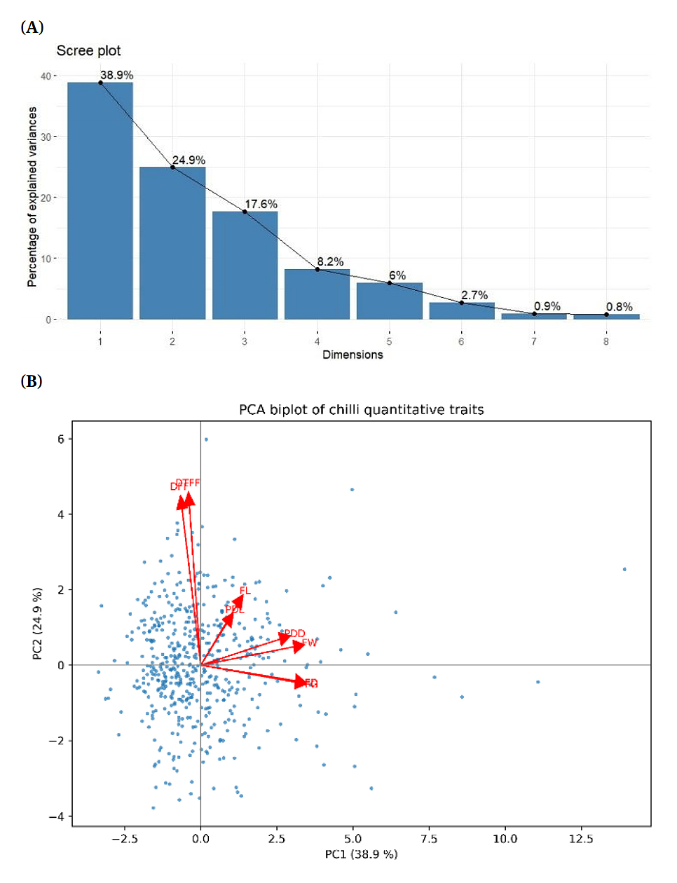 Principal component analysis (PCA) was performed on all eight quantitative traits across 470 chilli germplasm selections. PCA reduces a large set of correlated variables into a smaller number of uncorrelated variables, referred to as principal components, while retaining most of the variation present in original dataset [23]. After identifying key traits contributing to variability among genotypes, component loadings were calculated to reveal the underlying data structure (Table 4).