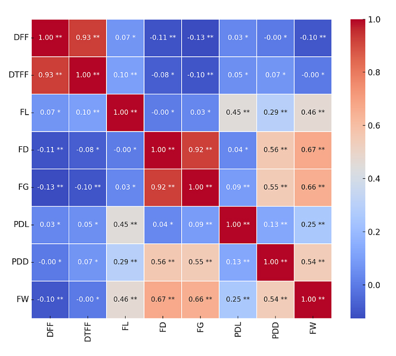 Figure 2. Correlation matrix of quantitative traits where; DFF: days to 50% flowering, DTFF: days to first fruiting, PDL: pedicel length (cm), PDD: pedicel diameter (cm) (PDD), FL: fruit length (cm), FD: fruit diameter (cm) (FD), FG: fruit girth (cm) and FW: fruit weight (g). * = non-significant (p ≥ 0.05); ** = Significant (p < 0.05).