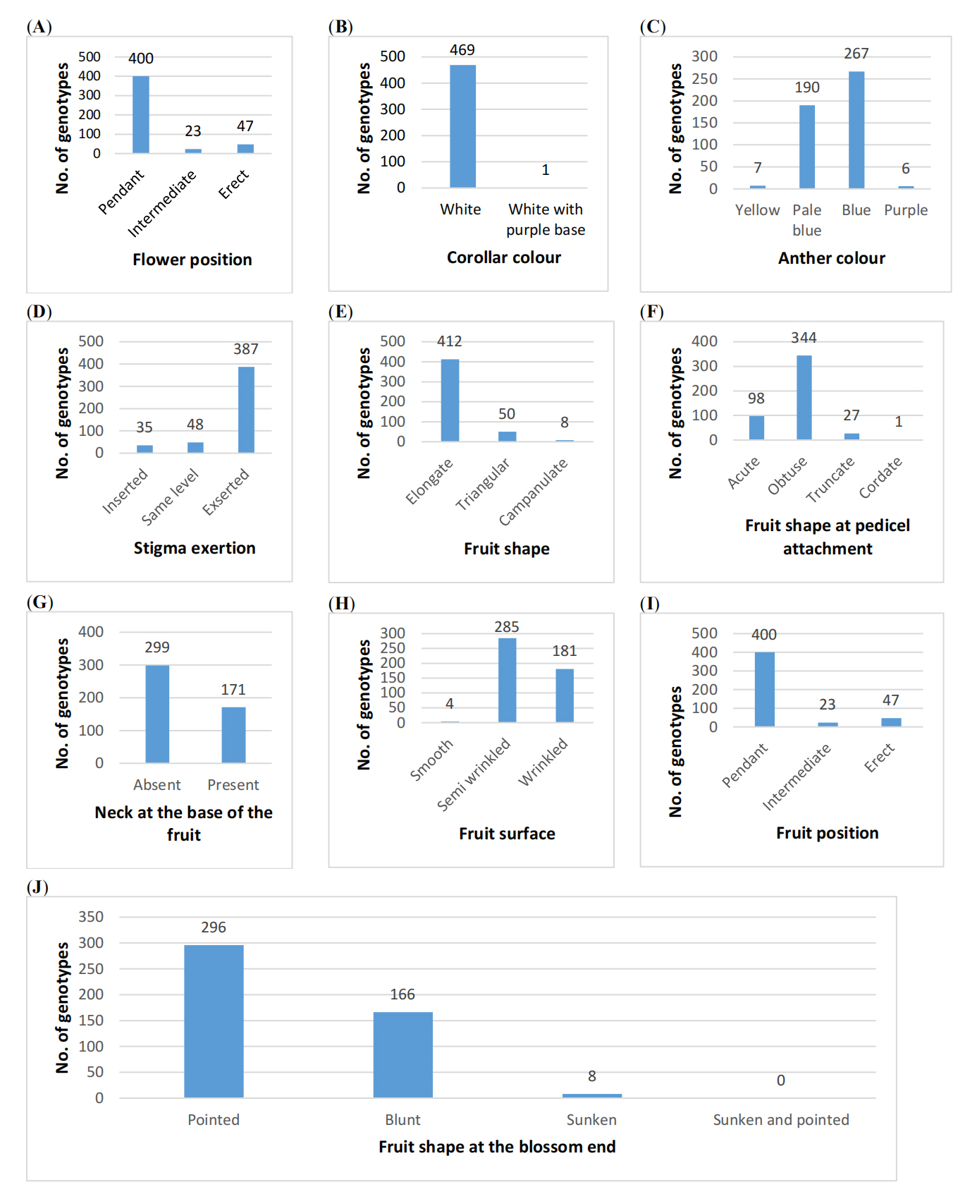 Figure 4. Variation in qualitative traits at flowering and fruit formation stage among 470 germplasm selections of chilli pepper (X-axis represents number of genotypes; Y-axis denotes the descriptor states corresponding to each trait). (A) Flower position (B) Corolla colour (C) Anther colour (D) Stigma exertion (E) Fruit shape (F) Fruit shape at pedicel attachment (G) Neck at the base of the fruit (H) Fruit surface (I) Fruit position (J) Fruit shape at the blossom end