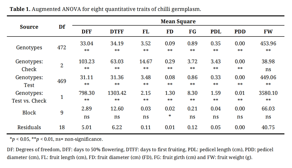 Analysis of variance (ANOVA) for all eight quantitative traits revealed highly significant differences among the genotypes (p < 0.01), indicating substantial genetic variability in the experimental material (Table 1). Block effects were non-significant (p > 0.05) for all traits except fruit length, for which the block effect was marginally significant (p < 0.05). However, the magnitude of variation attributable to block for this trait was considerably lower than the variation explained by genotypic effects.