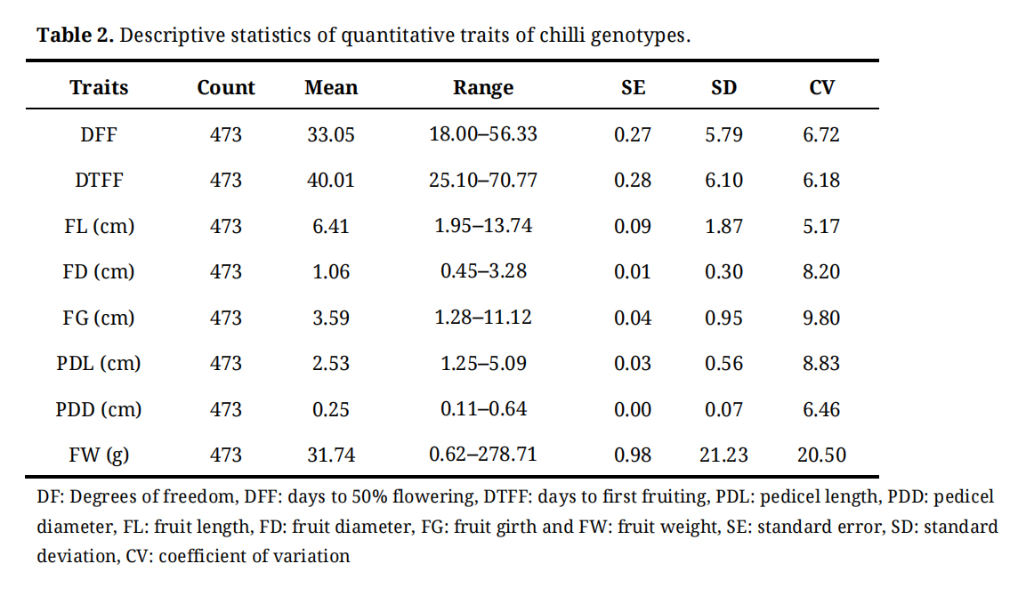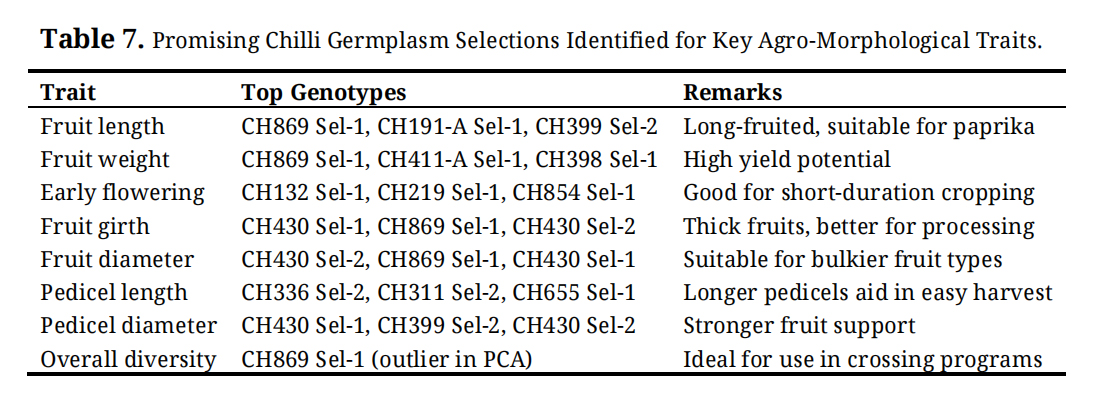 Future ScopeFuture research should capitalize on the diverse chilli germplasm identified in this study to develop short-duration, high-yielding, and market-preferred cultivars. Integrating marker-assisted selection and trait-specific breeding approaches can efficiently incorporate key attributes, such as early flowering, optimal fruit size, and weight. Furthermore, multi-location trials are recommended to assess genotype stability and environment adaptability. Additional biochemical and molecular characterization of promising lines can facilitate the identification of trait-linked markers, thereby enabling precision breeding. Together, these strategies will accelerate the development of improved cultivars, align with farmer preferences, and boost chilli productivity and market value.
