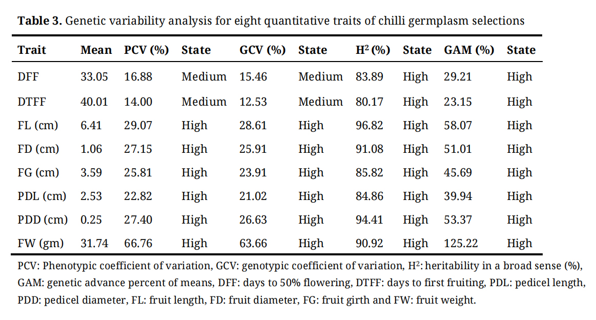 High heritability (H²) estimates were observed for all traits, with fruit length showing the highest value (96.82%). Additionally, all eight quantitative traits exhibited high GAM values, indicating substantial potential for genetic improvement through selection.