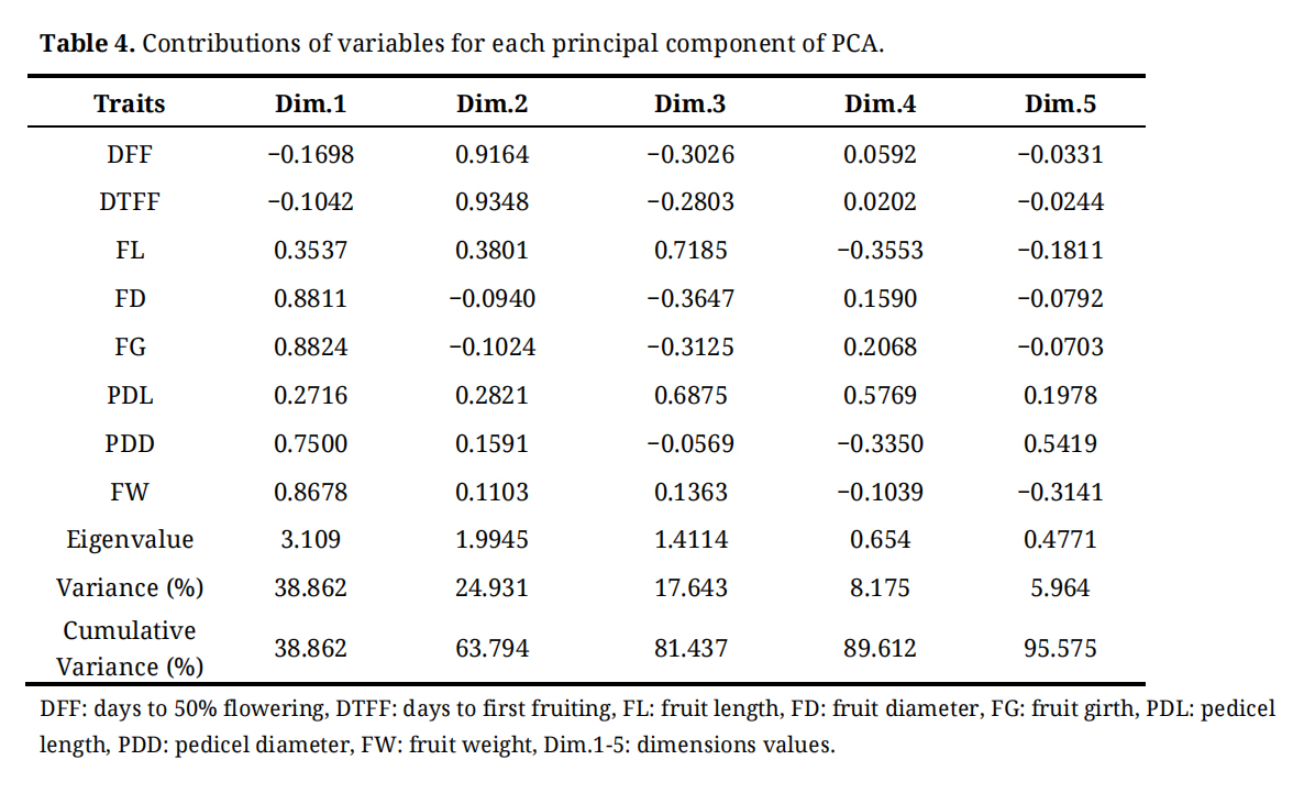 The principal component analysis (PCA) results the contribution of individual morphological traits to different principal components (PCs), which represent new composite axes summarizing overall phenotypic variation (Table 4). PC1 was primarily associated with fruit size and yield related traits, as indicated by high loadings for fruit diameter (FD), fruit girth (FG), and fruit weight (FW), suggesting that this component captures the major variation related to fruit size and yield potential.