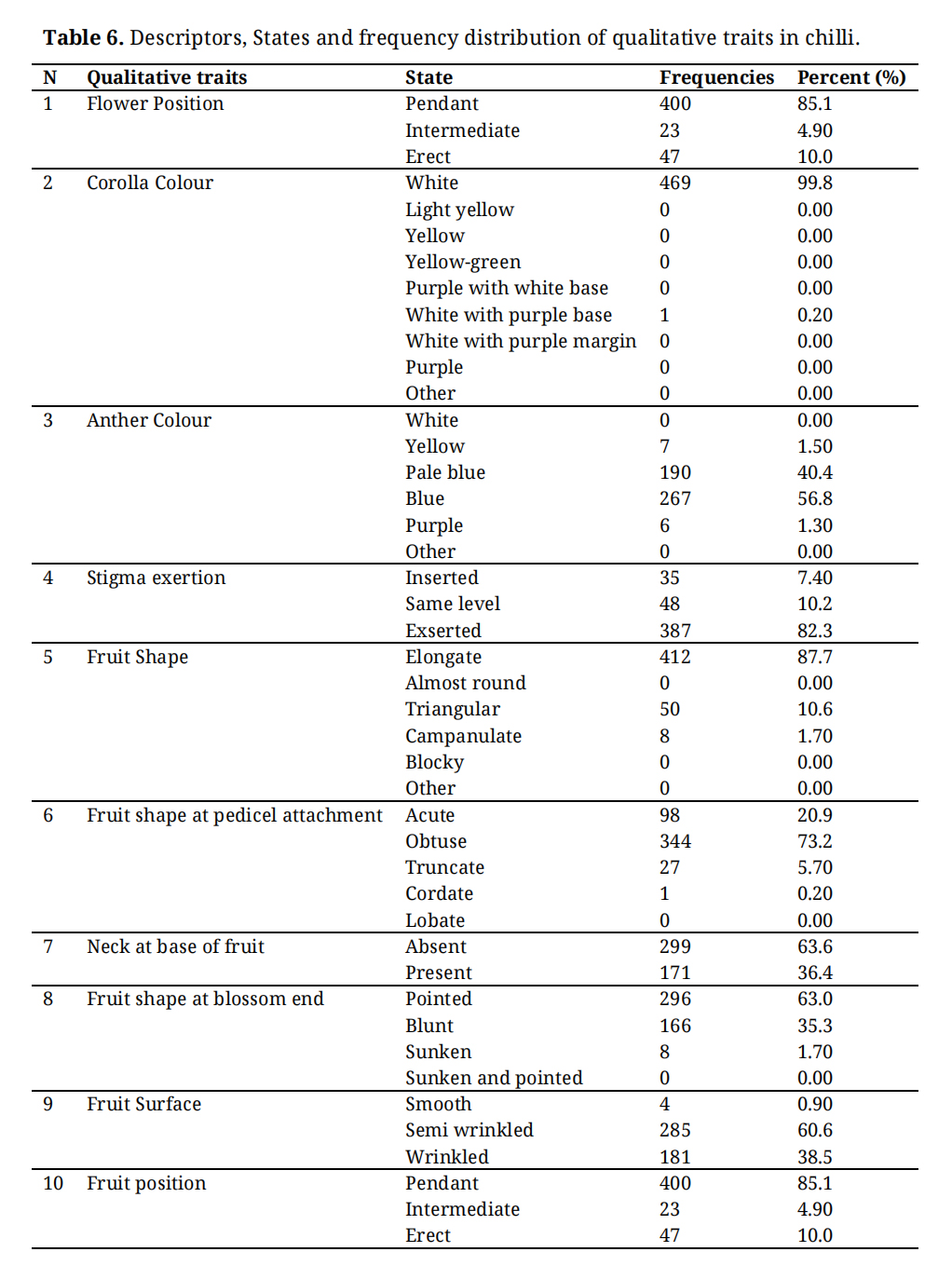 Fruiting stage:At the fruit formation and maturation stages, qualitative traits such as fruit shape (FS), fruit shape at pedicel attachment (SPA), neck at the base of the fruit (NBF), fruit shape at the blossom end (FSBE), fruit surface (FSRF) and fruit position (FRP) were recorded for all genotypes. Elongated fruit shape predominated (87.7%), followed by triangular (10.6%) and campanulate (1.70%) forms.