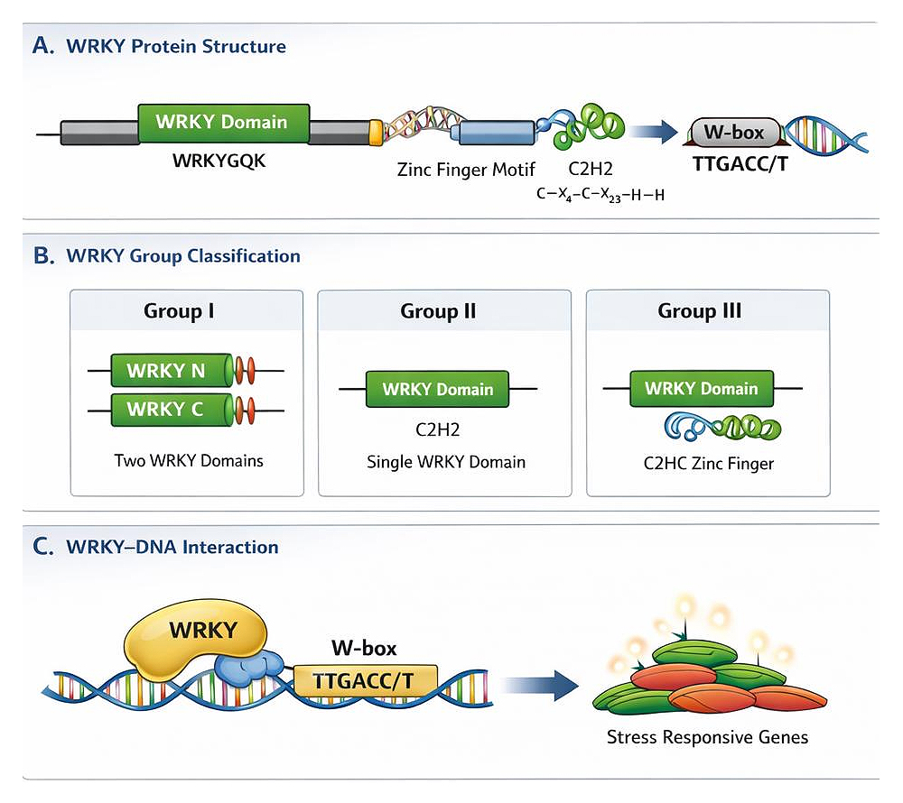 Beyond structural classification, WRKY transcription factors function as key regulatory nodes within plant stress signaling networks. They integrate hormonal signaling pathways and transcriptional crosstalk with other transcription factor families to coordinate appropriate gene expression responses under stress conditions. Through binding to W-box cis-elements in target gene promoters, WRKY proteins regulate the expression of genes involved in defense, stress tolerance, and cellular homeostasis. A simplified conceptual representation of WRKY–DNA interaction and activation of stress-responsive genes is shown in Figure 1C, highlighting the central role of WRKY transcription factors as transcriptional regulators in plant stress adaptation.