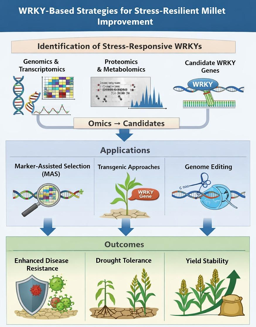 Figure 3. WRKY-based strategies for stress-resilient millet improvement. Conceptual overview showing identification of stress-responsive WRKY transcription factors through omics approaches and their application in marker-assisted selection, transgenics, and genome editing to enhance disease resistance, abiotic stress tolerance, and yield stability in millets.