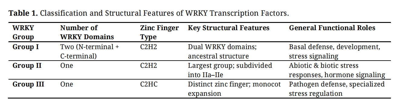 Structural Diversity and Functional ImplicationsThe functional versatility of WRKY transcription factors is closely associated with their structural diversity, which arises from variation in WRKY domain number, zinc finger configuration, and conserved sequence motifs. These structural features influence DNA-binding specificity and transcriptional regulatory capacity, enabling WRKY transcription factors to participate in a wide range of stress-responsive pathways. Differences in zinc finger motifs, particularly the C2H2 and C2HC configurations, further contribute to the diversification of regulatory activity among WRKY groups [11,16].