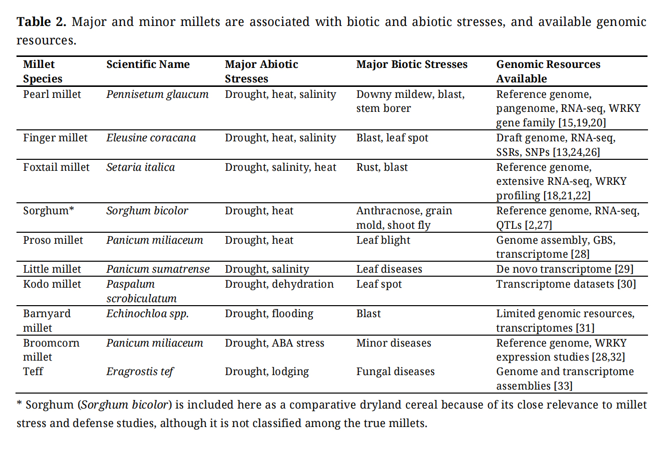 Major millets such as pearl millet, finger millet, and foxtail millet are climate-resilient cereals cultivated in arid and semi-arid regions of Asia and Africa. Their adaptability to low rainfall, poor soils, and high temperatures makes them important crops under changing climatic conditions [2,4]. Pearl millet (Pennisetum glaucum) is the most widely cultivated millet and exhibits strong tolerance to drought, heat, and salinity [2,17]. Finger millet (Eleusine coracana) is an allotetraploid species valued for stress resilience and disease resistance [3,13]. Foxtail millet (Setaria italica) is a diploid C4 grass with a compact genome, widely used as a model system for functional genomics and stress biology in grasses [18].