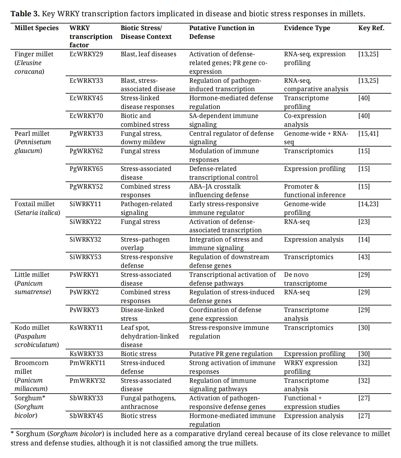In summary, while direct genetic evidence in millets is still emerging, extensive validation from Arabidopsis, rice, soybean, and sorghum strongly supports the central role of WRKY transcription factors in coordinating immune regulation and abiotic stress tolerance. Translating this mechanistic knowledge into millet species through genome editing and controlled expression strategies represents a critical step toward deploying WRKY-based interventions for multi-stress resilience.