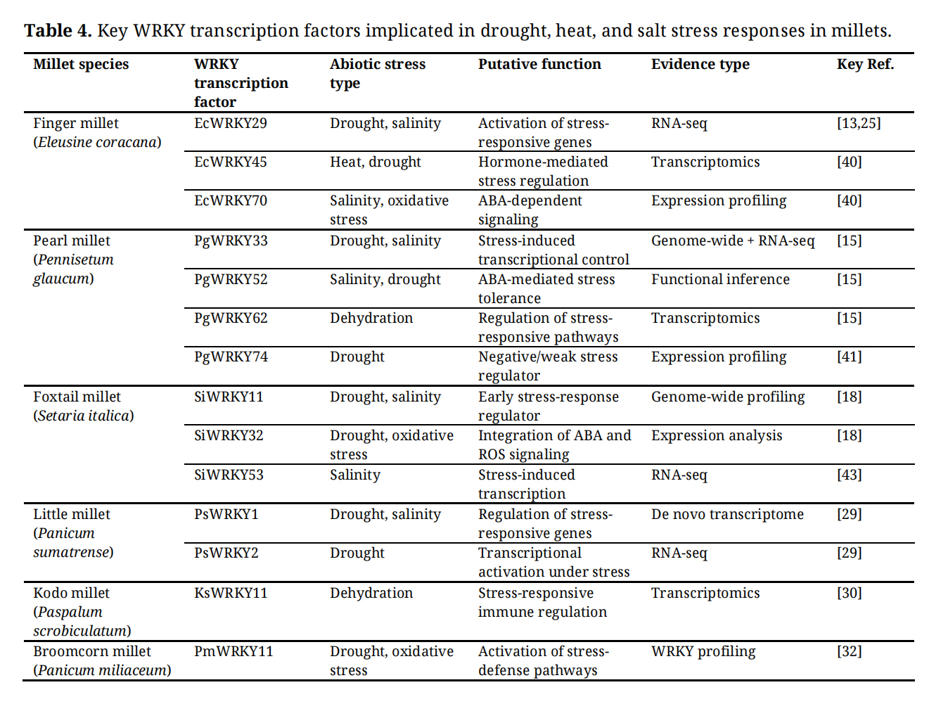 Ultimately, WRKY transcription factors represent a powerful yet underutilized regulatory layer in millet stress biology. Strategic integration of WRKY-based markers, regulatory networks, and gene-editing technologies holds substantial promise for developing climate-resilient millet varieties suited to future agricultural challenges.