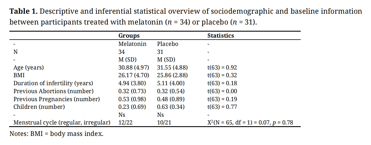 No descriptively and statistically significant mean differences between participants in the melatonin and control condition were observed for age, BMI, duration of infertility, number of abortions, pregnancies, children, and the menstrual cycle pattern.