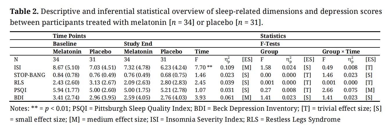 Results: OSA- and RLS-related values did not vary over time and within and between the melatonin and placebo conditions. Over time and irrespective of the melatonin or placebo condition, scores for insomnia decreased (significant p-value and medium effect size). Over time, scores for sleep disturbances descriptively decreased in the melatonin condition and descriptively increased in the placebo condition (medium effect size for the Time by Condition interaction). Next, scores for depression decreased descriptively over time, and irrespective of the study condition (always medium effect sizes).