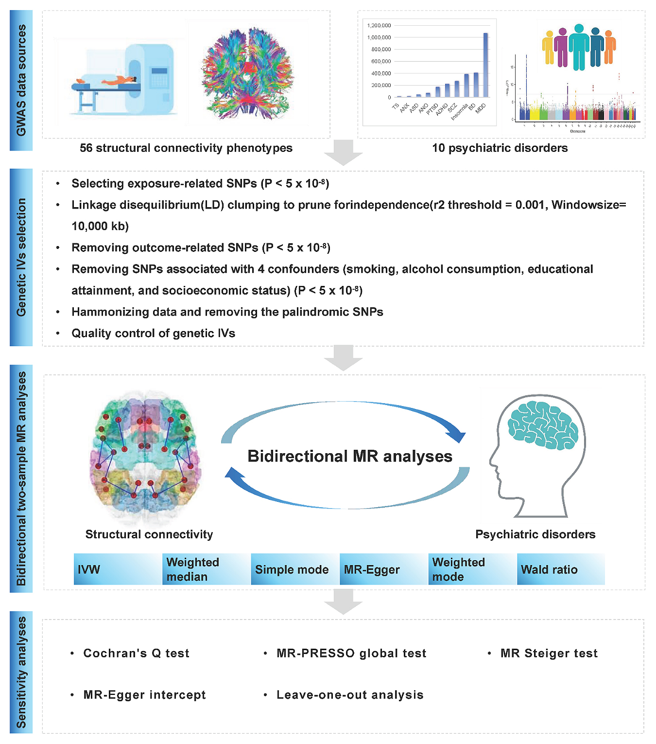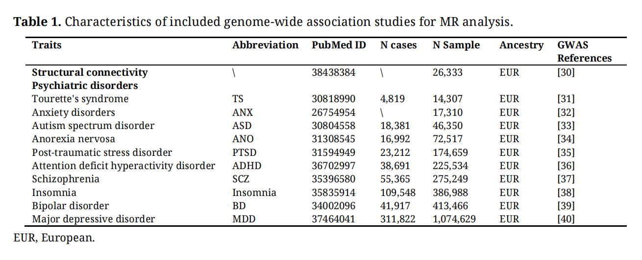 Although a few studies have focused on network-level connectivity abnormalities in psychiatric disorders, most of these have concentrated on changes in functional connectivity [24,26,27], with structural connectivity receiving much less attention. Furthermore, previous observational studies are limited in their ability to establish causal inference due to confounding variables and the possibility of reverse causation. Mendelian randomization (MR) provides a more reliable approach for examining causal relationships by using genetic variants, such as single nucleotide polymorphisms (SNPs), as instrumental variables (IVs) [28]. Since these genetic variants are randomly inherited at conception and unaffected by environmental or behavioral factors, MR provides a natural experiment that can help infer causality [29].
