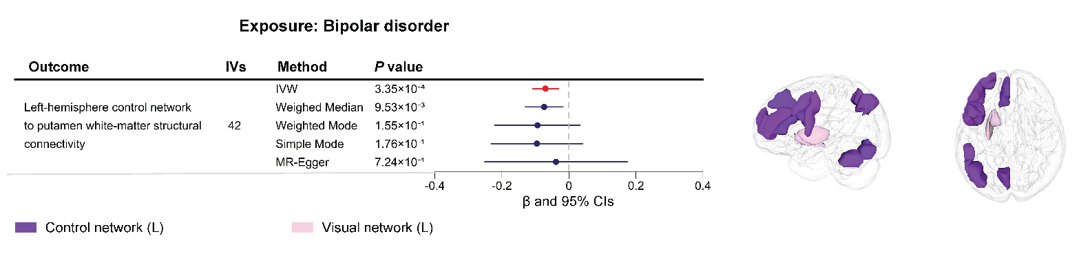 Reverse MR of Psychiatric Disorders on Structural ConnectivityIn the reverse MR analyses, we found evidence that BD was negatively linked to one structural connectivity phenotype. As shown in Figure 3 and Table S7, a higher risk of BD was associated with decreased white-matter structural connectivity between the left-hemisphere CN and the putamen (IVW β = −0.07, 95% CI: −0.11 to −0.03, P = 3.34 × 10−4).