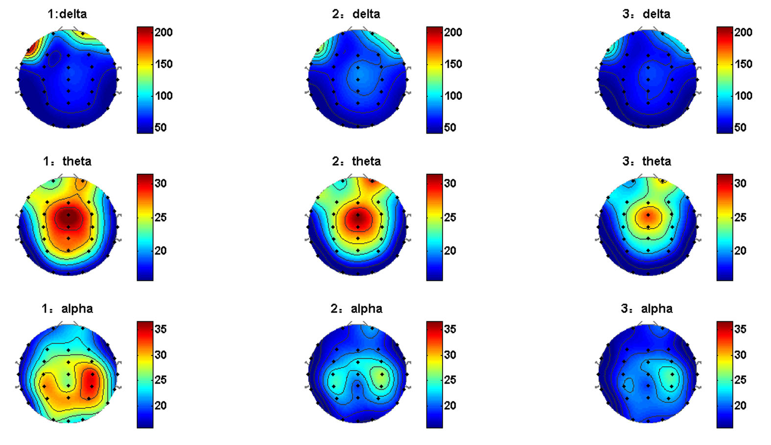 Figure 3 and Figure 4 exhibit the topographic distributions of six frequency bands averaged across 4 subjects. From the two figures it can be seen that, the delta power mainly concentrates in the right prefrontal lobe and the inferior frontal lobe, theta power in the central lobe, alpha power mostly in the parietal lobe, and beta and gamma power (gamma1 and gamma2) in the prefrontal lobe. The concentrated power distribution indicated that movie-induced tension were mainly focused on specific brain regions. Moreover, the power of delta, theta, and alpha bands decrease monotonically with the increase of intensity. In contrast, the power of beta, gamma1 and gamma2 bands demonstrated increased pattern towards lower tension intensity. These results suggest that different tension intensity could lead to changes of different EEG power bands, which can be in dissimilar alteration patterns. Moreover, these EEG variations tend to appear at different brain regions.