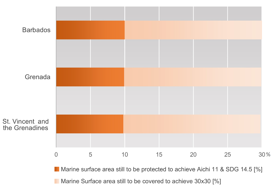 Current Policies and Frameworks in Relation to Fisheries: Biodiversity Targets and Climate ChangeIn terms of reporting on their National Biodiversity Strategy and Action Plan pursuant to their obligations under the Convention on Biological diversity and the Aichi Targets, Barbados and St. Vincent and the Grenadines have submitted their 6th National Reports in 2019. Grenada is yet to do so, having submitted their 5th National report in 2014. Aichi Target 11, defined at the sixth meeting of the Conference of the Parties (COP) signatories of the Convention on Biological Diversity, states that by 2020, 10% of the coastal and marine areas of the signatory countries should officially be protected. The same is so for the delivery of SDG target 14.5. Progress towards Aichi Target 11, is very far from achievement in all three countries (Figures 3 and 4). These targets, updated to achieving 30% protected area coverage of signatories’ exclusive economic zones (EEZs) by 2030, though COP15 has been hailed to go a long way towards averting the biodiversity crisis while also helping to address climate change. However, this is not without its criticisms, and remains controversial because of the chequered history of poorly designated and managed protected areas. While some have saved species from extinction and allowed for significant recovery of fisheries related resources, others—so-called ‘paper parks’—through ineffective management have caused severe impacts to fishing communities through forced displacement. In response to the 30 × 30 targets, the three focus countries have thus achieved very little given their marginal contributions to attaining the original 10% (Figures 3 and 4).