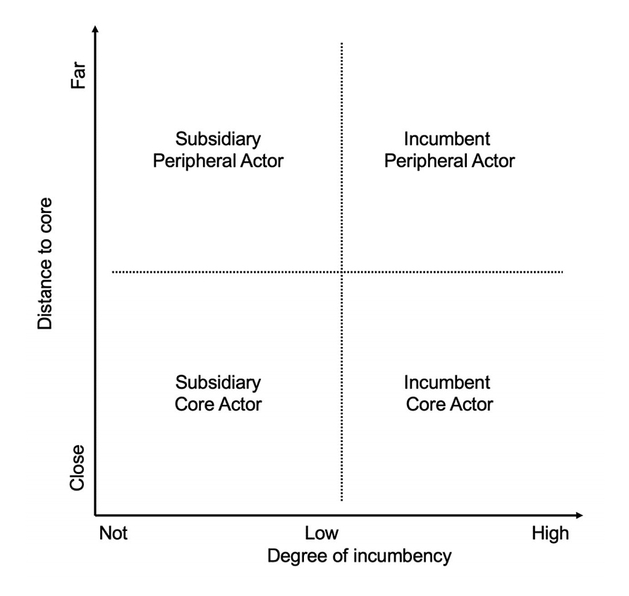 In summary, the classification of regime actors can be achieved along two dimensions. On the one hand, the degree of incumbency (first dimension) of an actor is contingent upon a certain degree of power and privilege within the regime. A regime actor can have significant power and influence (thus an incumbent actor) or limited power and influence in a given regime. We define the latter as a subsidiary actor. The second dimension relates to the distance from the core activity of the regime under scrutiny. This dimension is situational (so relative to the regime under scrutiny) and not normative, because an actor can be an ICA in a given regime while being an IPA in an adjacent regime. This leads to the view that four groups of regime actors can be distinguished as to whether an actor is incumbent or peripheral, as shown in Figure 1.