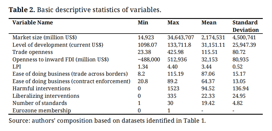 Table 2 presents the basic descriptive statistics for the variables used in the analysis, indicating the high level of diversity in the dataset. Standard deviations are quite high in general, suggesting that our database includes a wide diversity of cases from different countries.