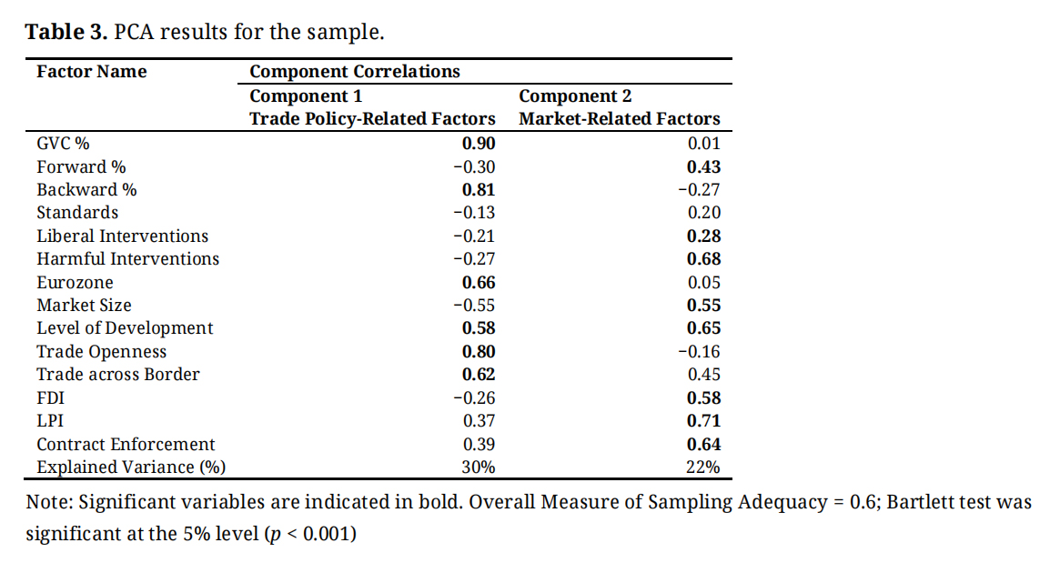 In the first step, principal component analysis (PCA) was undertaken for GVC, backward and forward participation, and all the influential (policy and market-related) factors. The purpose of the analysis was to graphically represent the data matrix in a two-dimensional space and determine the interrelationships between the factors by creating two latent components.