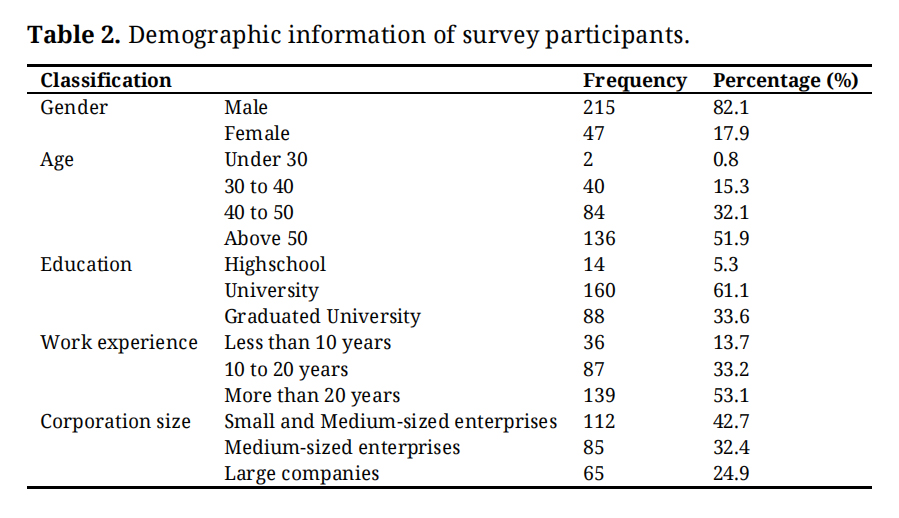 At the characteristics of the analysis data sample as shown in Table 2, 82.1% of the participants were male and 17.9% were female. In terms of age, 51.9% were over 50 years of age, 32.1% were in their 40s, 15.3% were in their 30s, and 0.8% were under 30s. In terms of educational background, 61.1% of people had a bachelor's degree and 33.6% were from college. In terms of career, 53.1% had more than 20 years of experience, 33.2% were under 10 to 20 years of experience, and 13.7% were under 10 years of experience. As for the size of the company, 42.7% of the respondents were employed in small and medium-sized companies, 32.4% were in mid-sized companies, and 24.8% were in large companies.