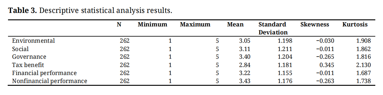Descriptive statistical analysis of variables was conducted (see Table 3). First, the average of the ESG environment was found to be 3.05 with a standard deviation of 1.198. The average of ESG social contribution was found to be 3.11 with a standard deviation of 1.211. The average of ESG governance was found to be 3.40 with a standard deviation of 1.204. The average of tax incentives was found to be 2.84 with a standard deviation of 1.181. The average of financial corporate performance was found to be 1.155. The average of non-financial corporate performance was found to be 3.43 with a standard deviation of 1.176. Skewness and kurtosis were used to confirm the normality of the data. As a result of the analysis, it was analyzed that the univariate normality assumption, in which skewness never exceeded 3 and kurtosis never exceeded 8, was valid.