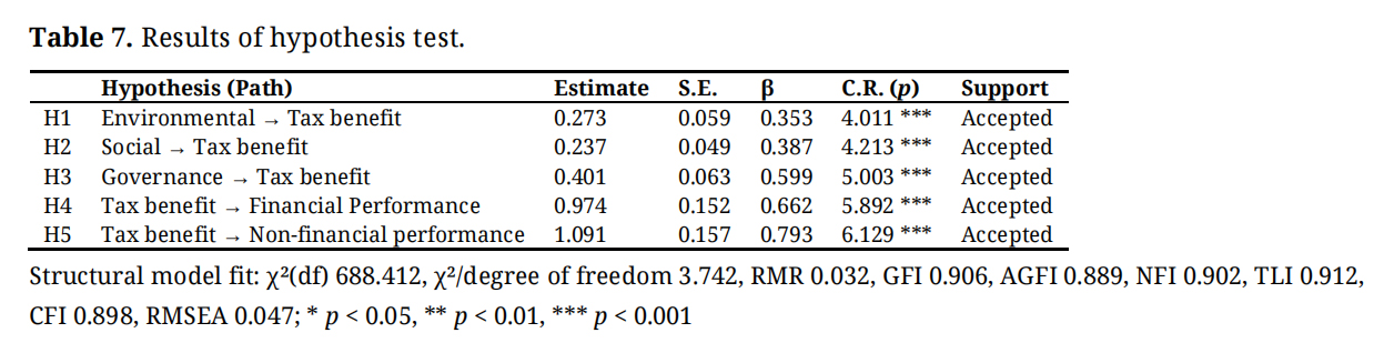 The goodness-of-fit of the structural model was analyzed (see Table 7), and the resulting χ² (df) value was 688.412, with a corresponding χ² degree-of-freedom value of 3.742. The model demonstrated satisfactory performance, with a Goodness-of-Fit Index (GFI) of 0.906 and a Normal Fit Index (NFI) of 0.902. The Root-Mean-Square Residual (RMR) was 0.032, the Adjusted Goodness-of-Fit Index (AGFI) was 0.889, and the RMSEA was 0.047, indicating that the model’s goodness-of-fit was significant. The CFI, which indicates the explanatory power of the model without being affected by the sample, was 0.898, and the TLI, which determines the explanatory power of the structural model, was 0.121. These values indicate that the basic model was a good fit. Hypothesis testing was conducted through path analysis of the structural equation model, which resulted in the acceptance of the five hypotheses. ESG Environmental had a positive effect on tax benefits (4.011, p < 0.001) and ESG Social Contribution had a positive effect on tax benefits (4.213, p < 0.001) and ESG Governance had a positive effect on tax benefits (5.003, p < 0.001). Tax benefits had a positive effect on financial corporate performance (5.892, p < 0.001) and non-financial performance (6.129, p < 0.001).