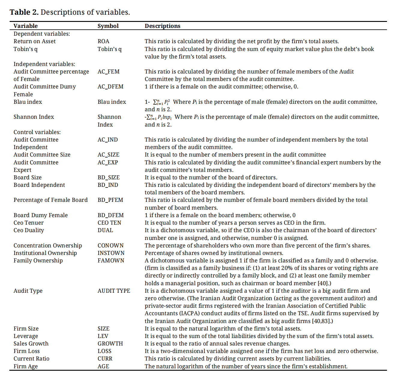 In recent decades, gender diversity on corporate boards and audit committees has become a central topic in the corporate governance literature. While numerous studies suggest that women’s participation can improve firm performance by reducing discrimination, enhancing decision-making, and increasing legitimacy, empirical findings remain mixed and inconclusive across countries. Some research documents a positive effect, while others find neutral or even negative outcomes. Globally, women still hold only 23.3% of board seats, according to the 2024 Deloitte global survey, indicating that less than one-fourth of top leadership positions are occupied by women despite continuous progress [1]. Building on this global evidence, prior research has extensively examined the impact of women’s presence on corporate boards over the past decade [2–5]. Board gender diversity is believed to influence firm performance through two primary channels: reducing gender discrimination and leveraging diversity advantages [6], as well as ensuring compliance with mandatory gender equality regulations [7,8]. Despite increasing attention to this issue, prior studies present mixed and often inconclusive findings regarding its financial implications. While some research highlights a positive relationship between female board representation and firm performance [9–13], others suggest no significant effect [14–16], and some even report a negative association with financial and market performance [17–19]. Most of these studies have been conducted in developed economies such as the United States [20–22] and Europe [5,11,23], with limited research in emerging markets like China [3] and Nigeria [24].While prior studies have explored gender diversity and firm performance across different economic contexts, this study addresses a critical gap by focusing on Iran, a developing economy with distinct corporate governance challenges and gender dynamics.