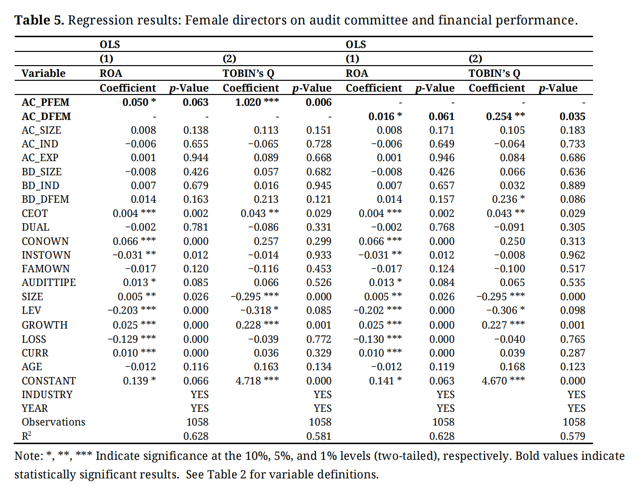 Table 5. Regression results: Female directors on audit committee and financial performance.