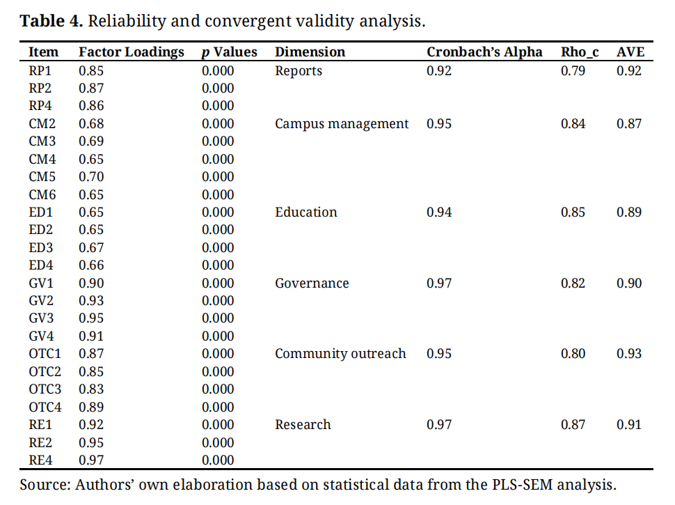 The limitations of this study lie in its focus on the student perspective within the Colombian context. Thus, future research could address other stakeholders and conduct comparative multigroup studies, expanding the scope of investigations to foreign HEIs. While results contribute valuable insights into sustainability performance and student perceptions within Colombian accredited universities, they should be interpreted within this national context. Nevertheless, findings provide a useful reference for similar institutions across Latin America that look to strengthen their sustainability governance and reputation management. Therefore, the main theoretical implications of this study are helping research on university sustainability by providing evidence of the dimensions that could be confirmed in the sustainability management at HEIs. It also contributes to studies that seek to involve students as a central axis of the university mission. Regarding managerial implications, it is a tool that could support planning processes and accountability before various institutions of society and the State.
