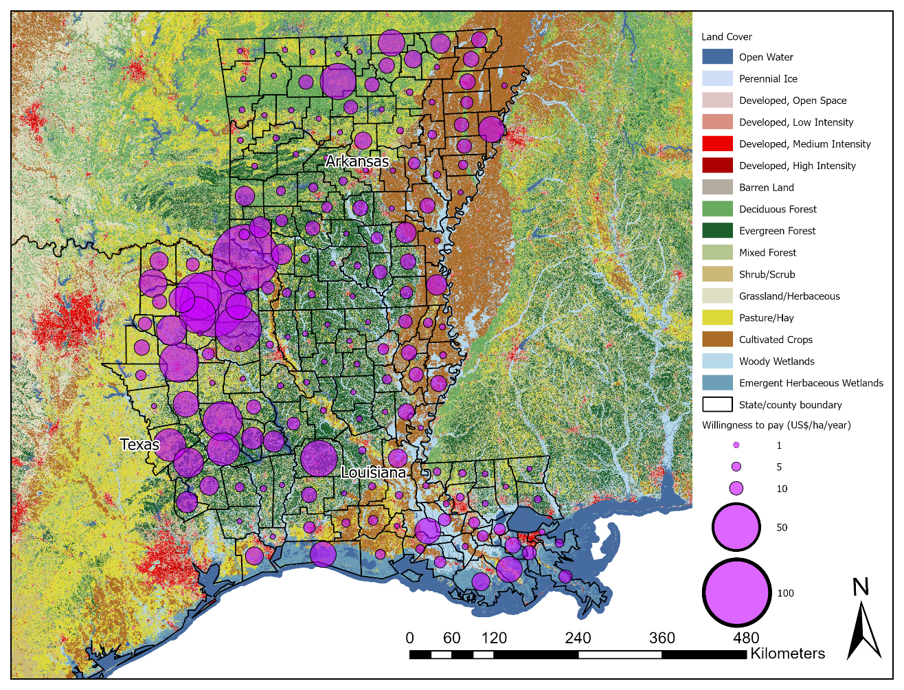 Finally, WTP may be related to the feral swine-induced damage that landowners have experienced. The damage is often associated with land use type that represents the geographic distribution of major crops, livestock, and forest products, as well as natural ecosystems [1,2]. Thus, we also attempt to map the elicited WTP values in relation to land use at the county level by utilizing the National Land Cover Database (NLCD) [33] and the National Boundary Dataset (NBD) [34] from the U.S. Geological Survey (USGS). This also allows us to analyze potential variations in WTP across geographic areas.