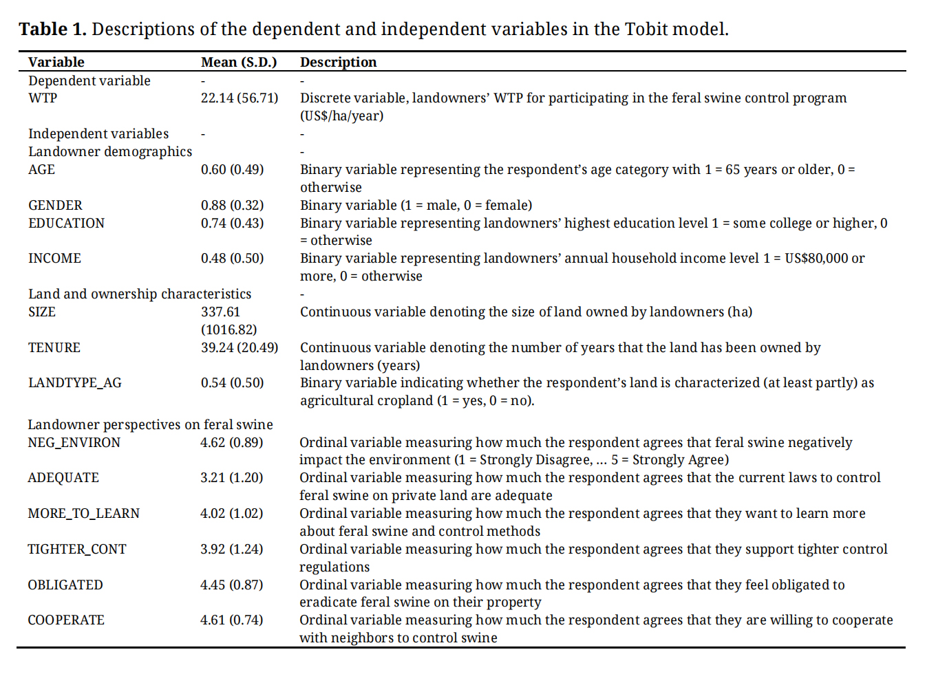 Econometric ModellingWe employed econometric analysis to examine the determinants of landowners’ WTP for a feral swine management and control program. Following the theoretical framework on collective action and planned behavior [35–39] and previous studies in a similar field [45–47], we specified WTP as a function of several key factors. Also, we utilized previously compiled datasets on landowners’ attitudes and perceptions toward feral swine control [1,15]. In our framework, WTP was modelled as a function of landowner demographics (age, gender, education, and income), land and ownership characteristics (acreage, tenure, and land type), experience with feral swine (frequency of sightings and perceived damage), activities to control feral swine, and attitudes toward feral swine control in neighboring lands.