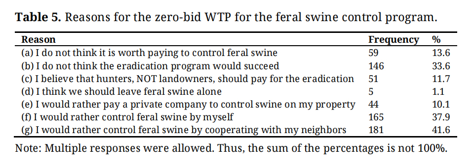 To better understand the reasons behind zero WTP, respondents who indicated a zero bid were asked to explain their reasoning (Table 5). Multiple responses were allowed. The most common reason was a preference to control feral swine by cooperating with neighbors (41.6%), followed by preferring to control them independently (37.9%), and believing that the eradication program would not succeed (33.6%). Fewer respondents selected objections to paying, such as “I do not think it is worth paying to control feral swine” (13.6%) or “I believe the hunters, NOT landowners, should pay for the eradication” (11.7%).