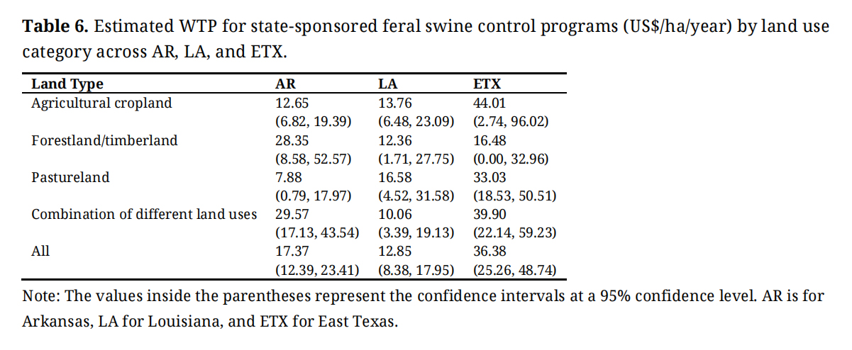 This study shed new light on private landowners’ WTP for feral swine control programs in the WGR by employing a structured mail survey and a two-part hurdle econometric model. The average WTP varied across states (US$12.85–36.38/ha/year) and land uses. Private landowners’ WTP for a control program is also associated with factors such as damage experienced, trust with neighbors, attitudes toward control statements, subjective norms, and demographics. Specifically, we found that landowners who experienced greater economic damage from feral swine, had higher levels of education, were male, had previously taken control actions, or viewed feral swine management as a personal responsibility, were more likely to participate in a swine control program with higher WTP amounts. These results reveal regional commonalities as well as differences and could be useful for policymakers and practitioners in designing and deploying incentive-based mechanisms to motivate private landowners to participate in feral swine control in the region.