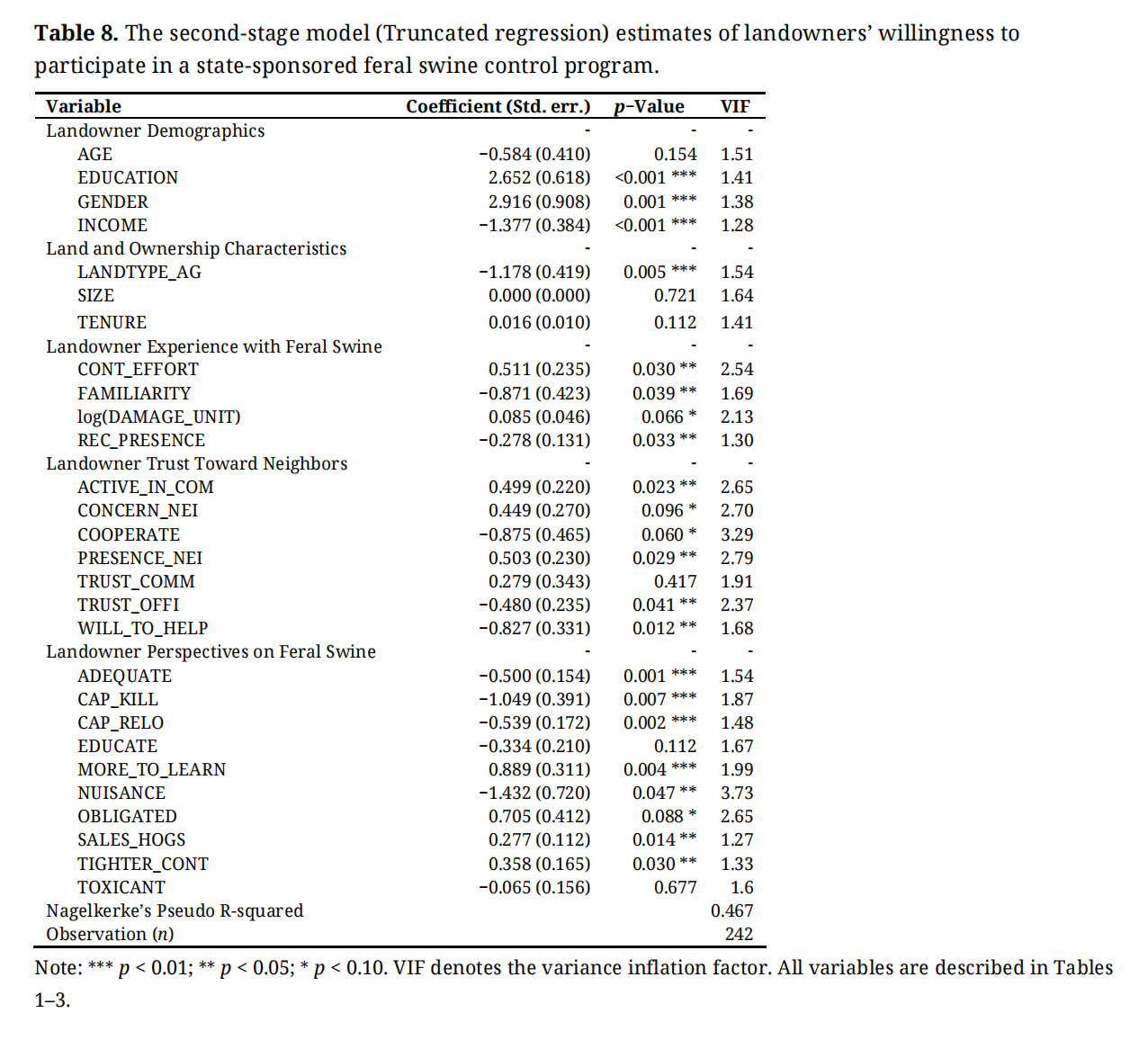 (2) Experience and trust with neighbors: For landowner experience, how recently swine were present on the property (REC_PRESENCE) was the only significant factor, negatively associated with landowners’ willingness to participate. Among the variables of landowner trust toward neighbors, lower trust in the community (TRUST_COMM) and a preference to cooperate with neighbors (COOPERATE) were significantly related to their WTP.