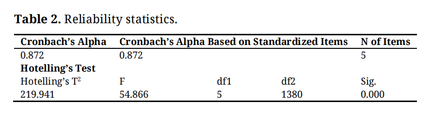 Table 2 presents the reliability, and the results of Hotelling’s T-square test. The number of scale items is 5, the Cronbach’s alpha is 0.872, which exceeds the reference value (0.7), indicating that the scale provides reliable data. The Hotelling’s T2 = 219.941 at (p = 0.000 < 0.05) significance level is significant. This means that there is a significant difference between the means of the variables examined. This means that the company representatives evaluated variables to a different extent.