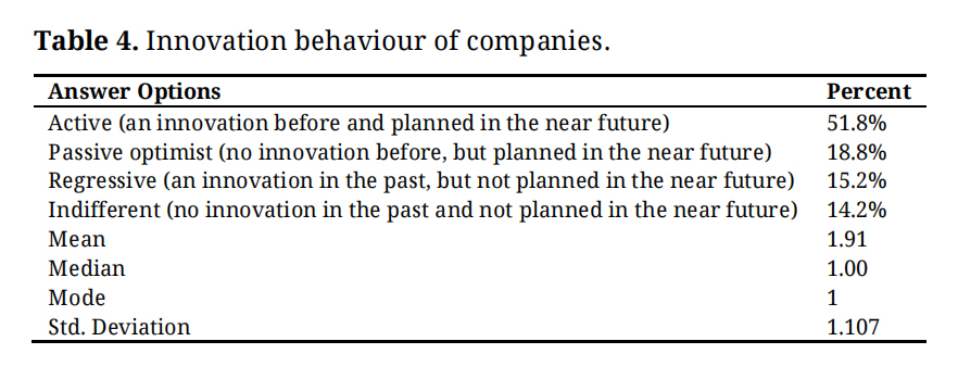Table 4 presents the innovation behaviour of companies. The innovation behaviour of SMEs is active in 51.8% of cases, meaning that innovation has already taken place in the past and is planned for the future as well. For 18.8% of SMEs, innovation behaviour is passive, meaning there has been no innovation so far, but it is planned in the near future. For 15.2% of SMEs, it is regressive, indicating that there has been innovation in the past but none is planned in the near future. Finally, 14.2% of SMEs exhibit indifferent innovation behaviour, meaning there has been no innovation in the past and none is planned for the future either. However, the Std. Deviation (1.107) is significant, which means that the companies show a diverse picture in terms of innovation behaviour.