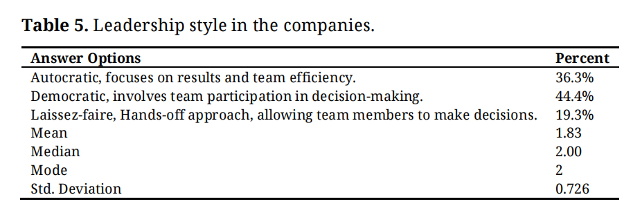 Table 5 presents the leadership style in the companies. Although the literature review presents modern leadership strategies and styles, we believe these are less typical and widespread in the SMEs; therefore, we focused on the three classical leadership styles: autocratic, democratic, and laissez-faire. However, it is important to note that there is a lot of overlap between modern transformative leadership and democratic leadership. In 44.4% of SMEs, the democratic leadership style prevails, meaning that leaders involve employees in decision-making, encourage teamwork, and consciously build team spirit. In 36.3% of SMEs, the autocratic leadership style dominates, meaning that leaders exercise full control and authority without considering employees’ opinions. In 19.3% of SMEs, the laissez-faire leadership style prevails, meaning that leaders allow employees a high degree of autonomy without direct supervision.
