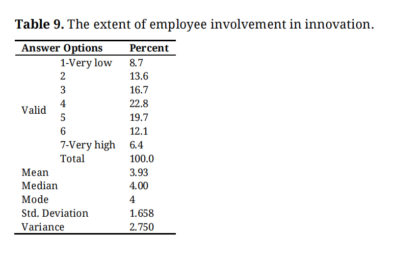 Table 9 presents employee involvement in innovation with descriptive statistics. Mean = 3.93, which indicates that the management involves employees in innovation to a moderate extent. This is also supported by the Mode and Median values. Based on the Std. Deviation (1.658), it can be said that the involvement of employees in innovation showed a varied picture in Hungarian SMEs.