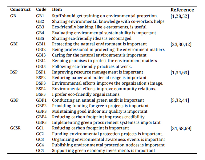 GBIGBI reflects employees’ and customers’ perceptions of a bank’s commitment to environmental responsibility and sustainability [5]. It was assessed using five items adapted from Gazi et al. [5] and Sharma and Choubey [54]. A sample item includes “The advancement of expertise in conservation is crucial.” The Cronbach’s alpha for this construct was 0.971, indicating high internal consistency.