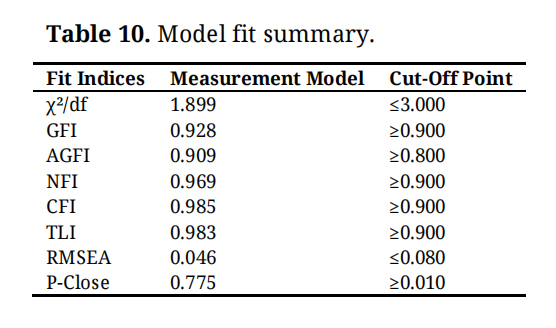 Structural Model Analysis and DiscussionThe study employed SEM to test the hypothesized relationships among the constructs. The measurement model demonstrated satisfactory fit, indicating that the data adequately represented the proposed theoretical structure. The model fit indices (CMIN/DF = 1.899, CFI = 0.985, TLI = 0.983, IFI = 0.985, GFI = 0.928, AGFI = 0.909, NFI = 0.969, RMSEA = 0.046) are all within acceptable thresholds [56], confirming strong model adequacy (Table 10).